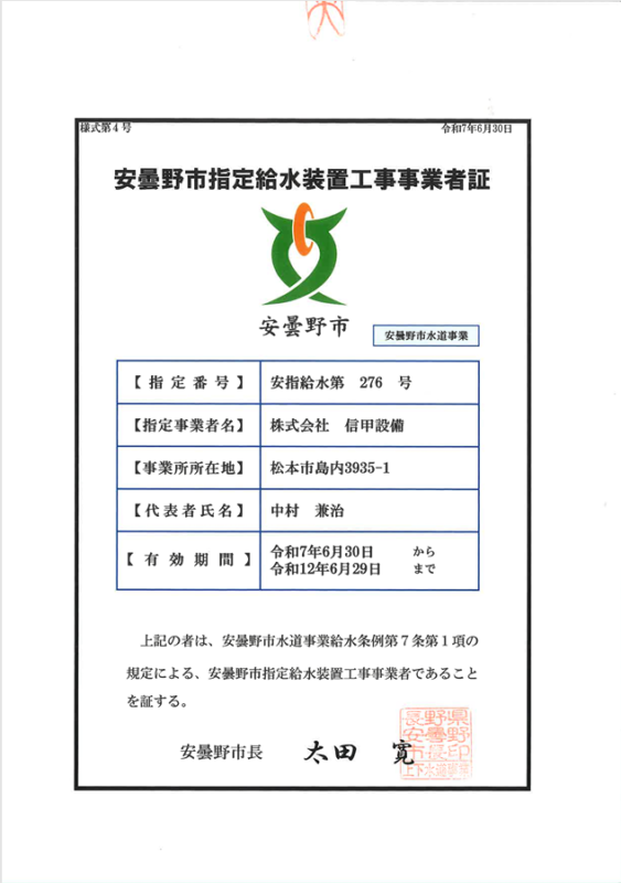 この度、信甲設備は安曇野市の指定給水装置工事事業者として指定されました。